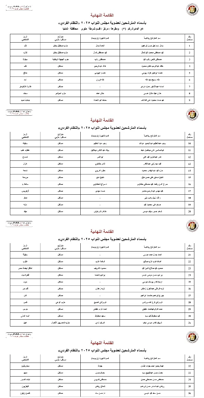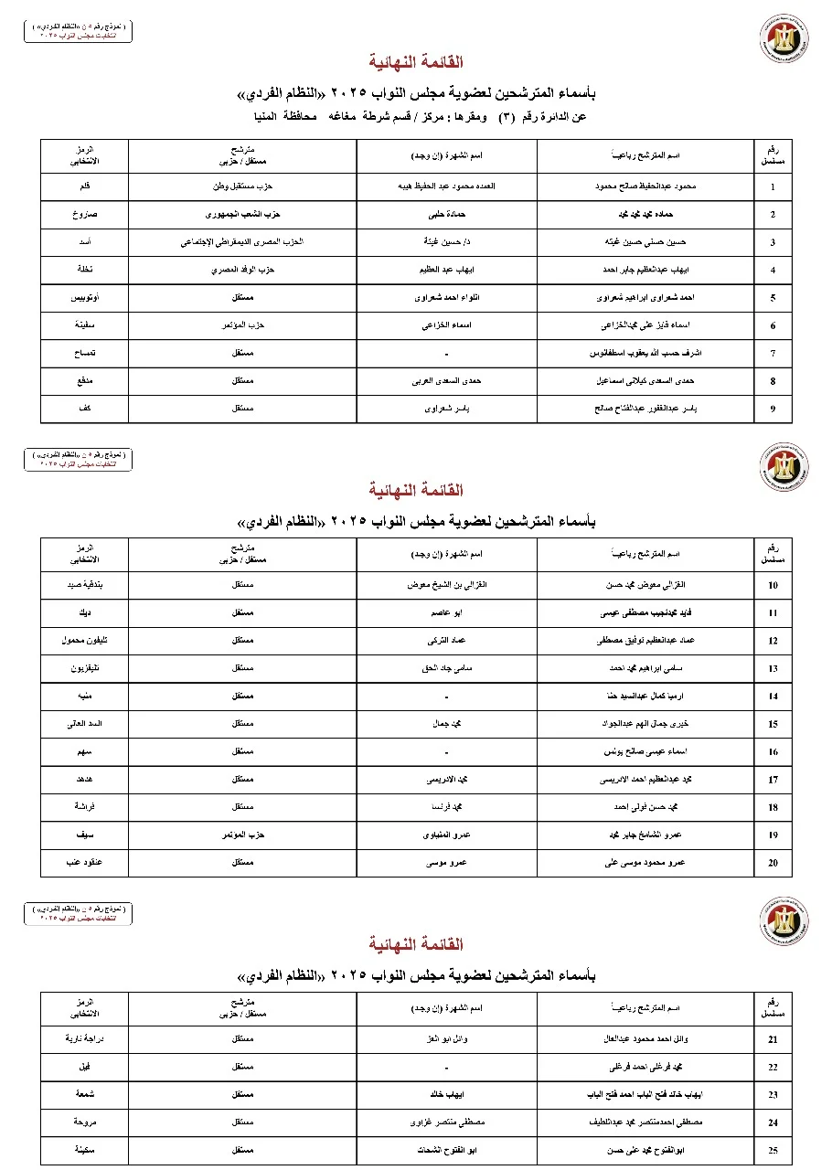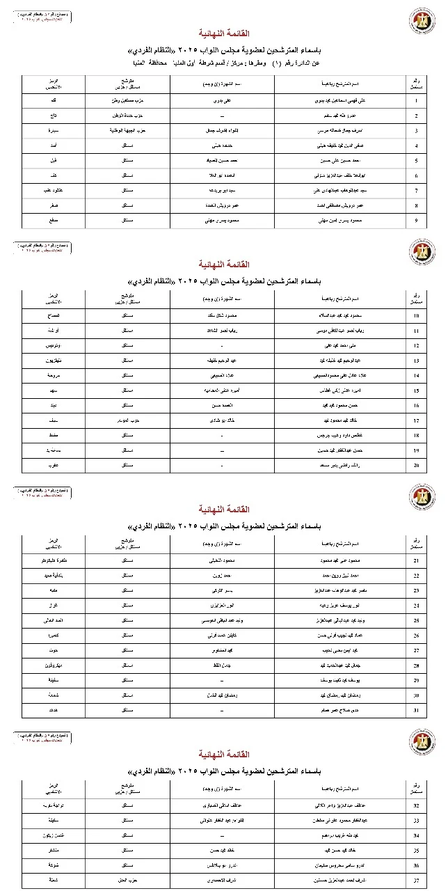 القائمة النهائية لمرشحي دوائر محافظة المنيا علي النظام الفردي