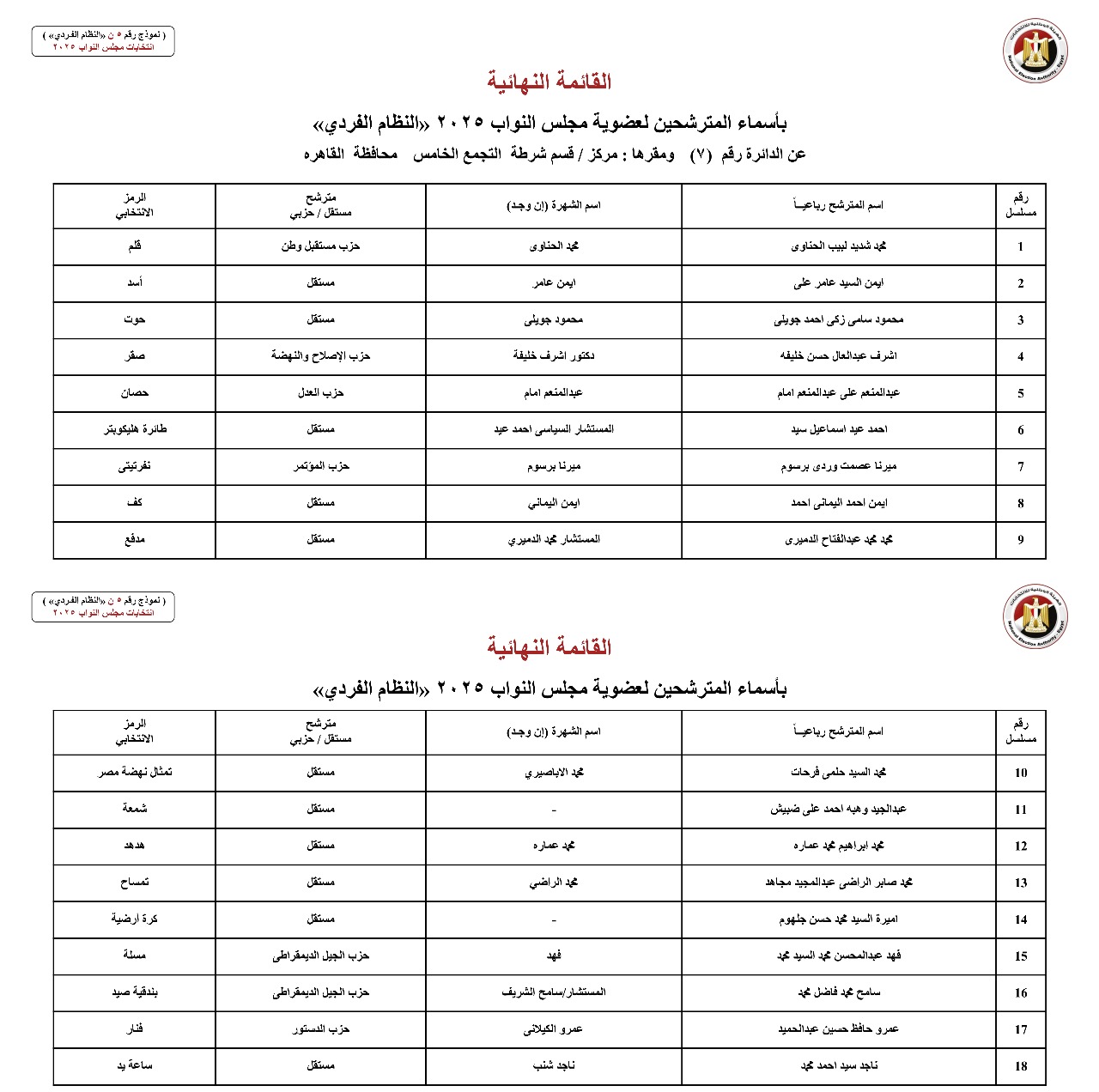 القوائم النهائية لمرشحي القاهرة بالنظام الفردي في انتخابات النواب 2025