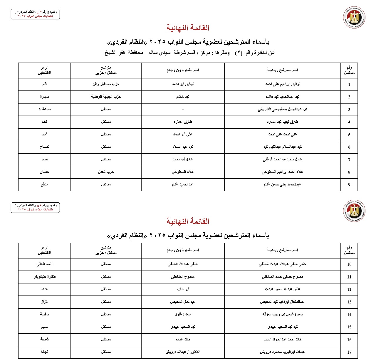 القوائم النهائية لمرشحي كفر الشيخ في انتخابات مجلس النواب 2025