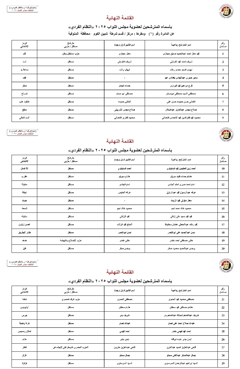 وجاءت أسماء مرشحي محافظة المنوفية في انتخابات مجلس النواب 2025، على النحو التالي: