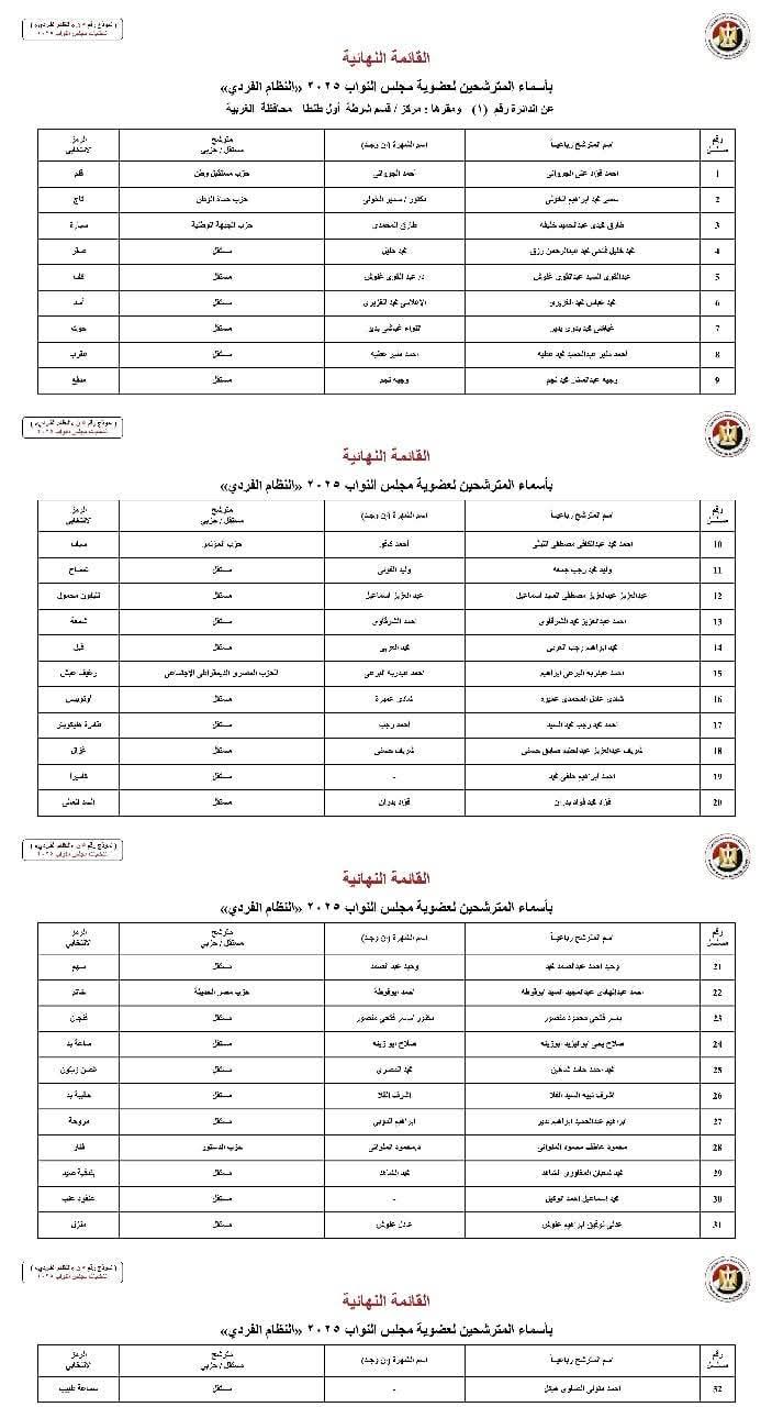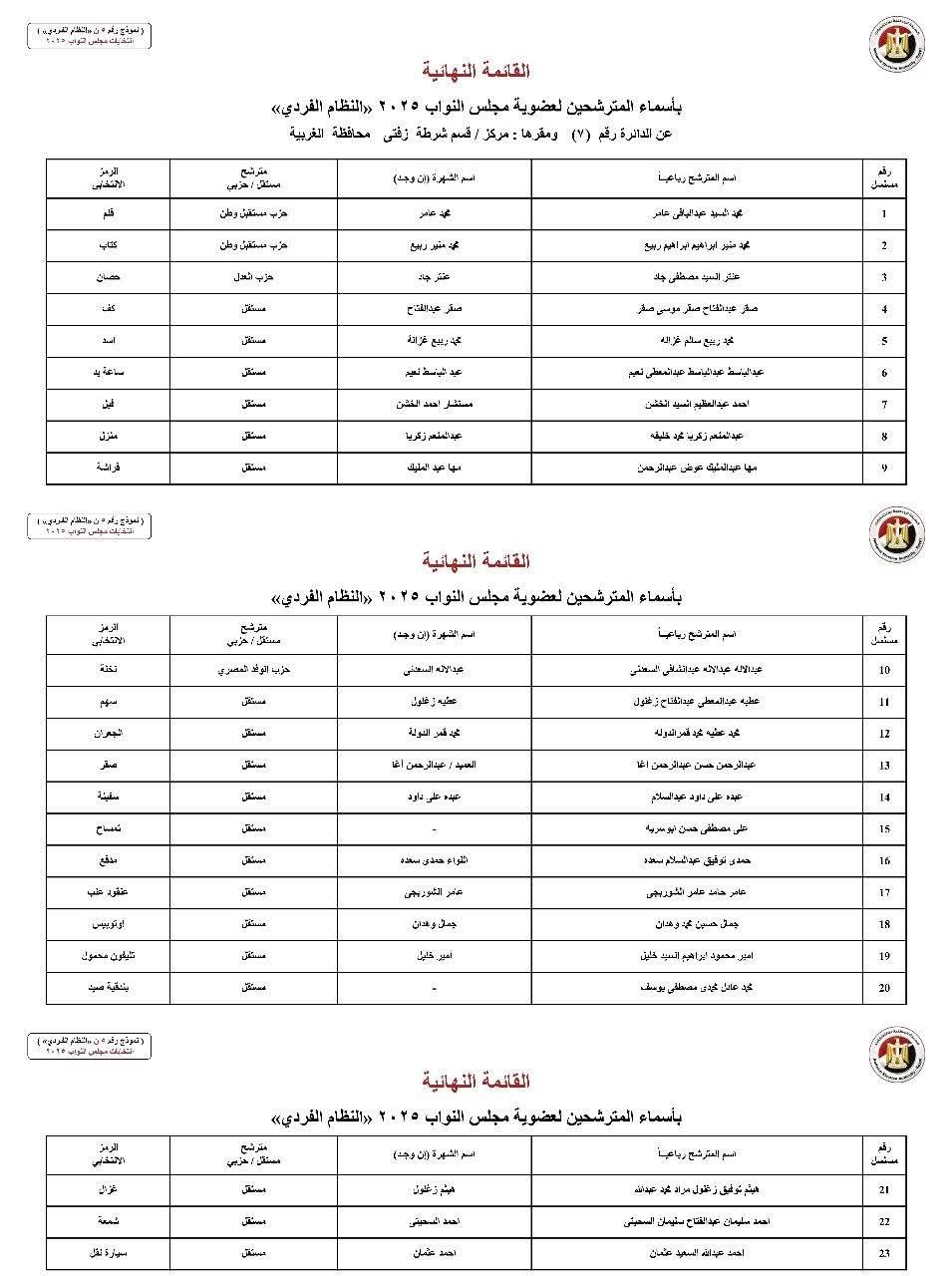انتخابات مجلس النواب، القائمة النهائية لمرشحي النظام الفردي في محافظة الغربية