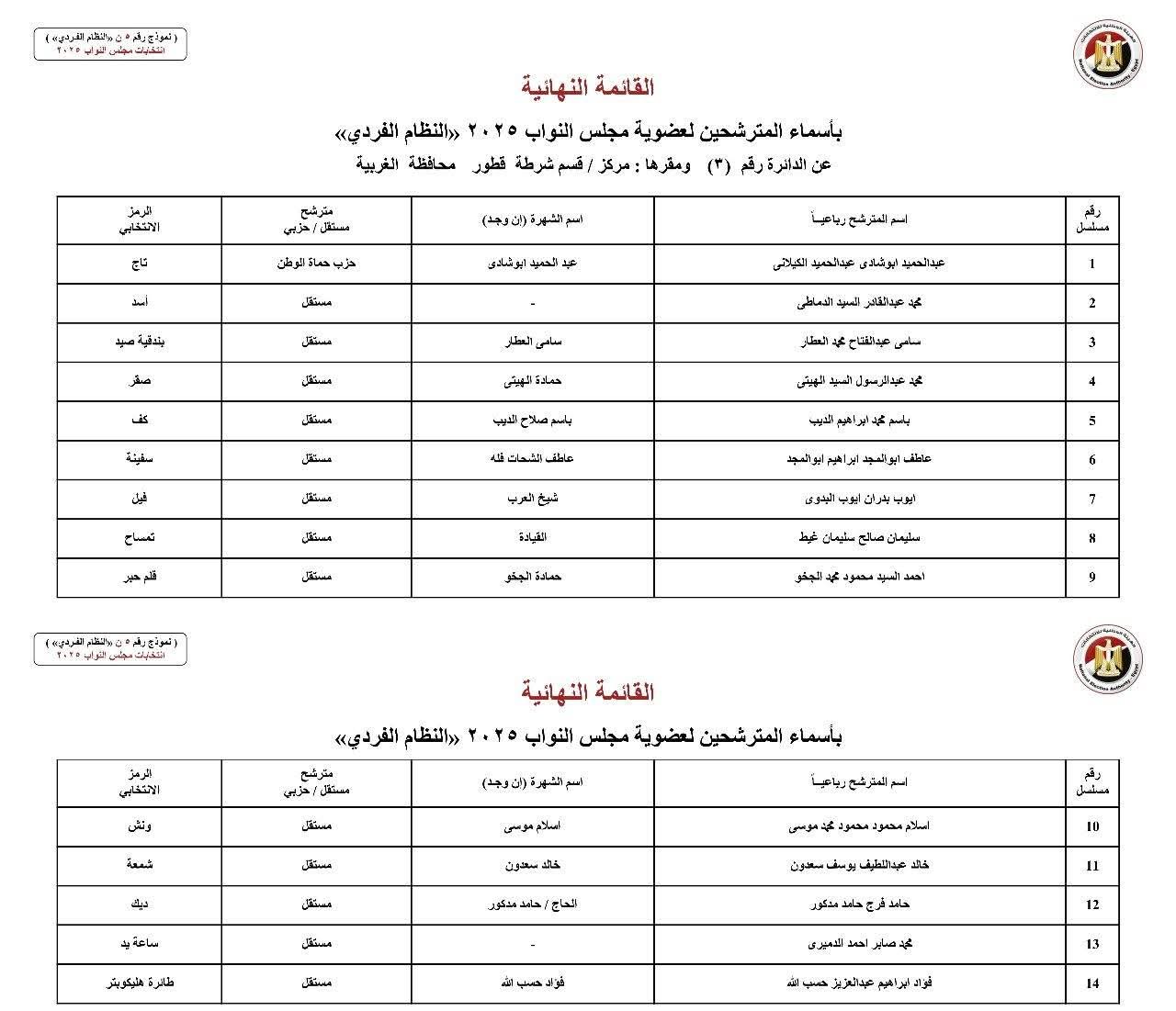أعلنت الهيئة الوطنية للانتخابات، القائمة النهائية لأسماء المرشحين الذين سيتنافسون وفق النظام الفردي في انتخابات مجلس النواب 2025 بمحافظة الغربية، بعد انتهاء جميع مراحل الفحص والطعون واستكمال الإجراءات القانونية المنظمة للعملية الانتخابية.