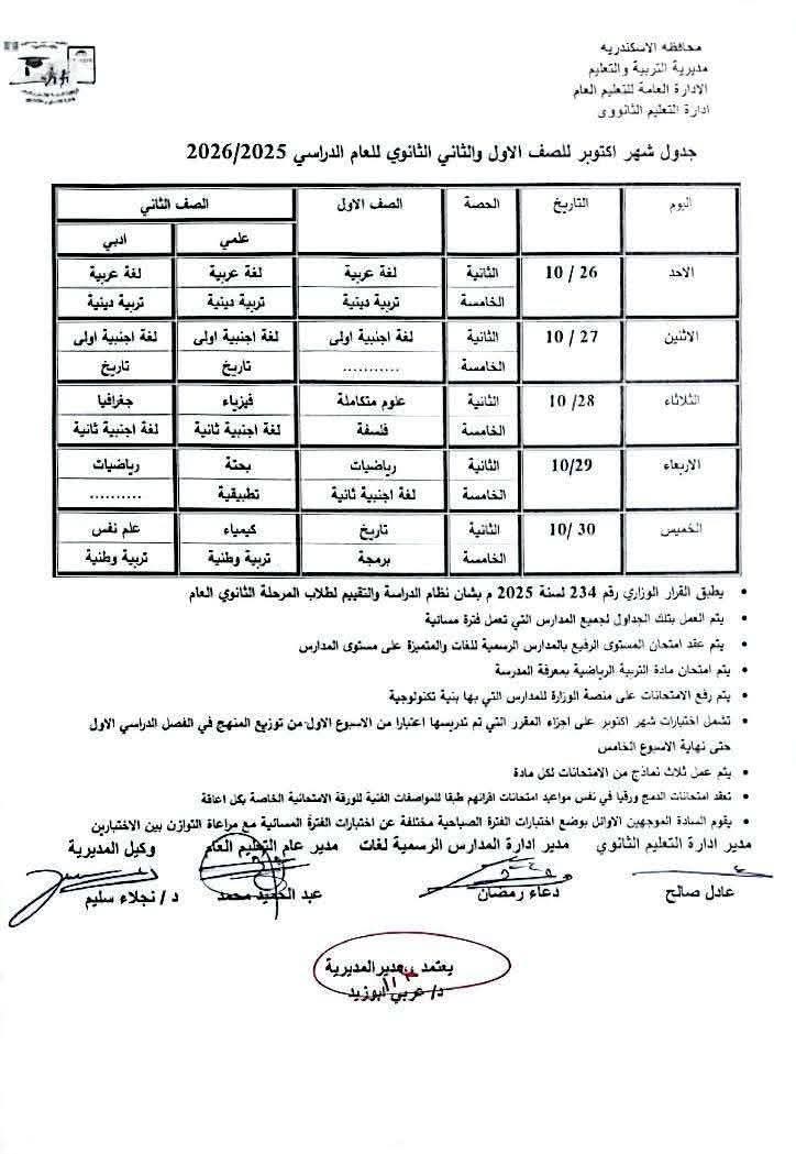 جدول امتحانات شهر أكتوبر المرحلة الثانوية بالإسكندرية