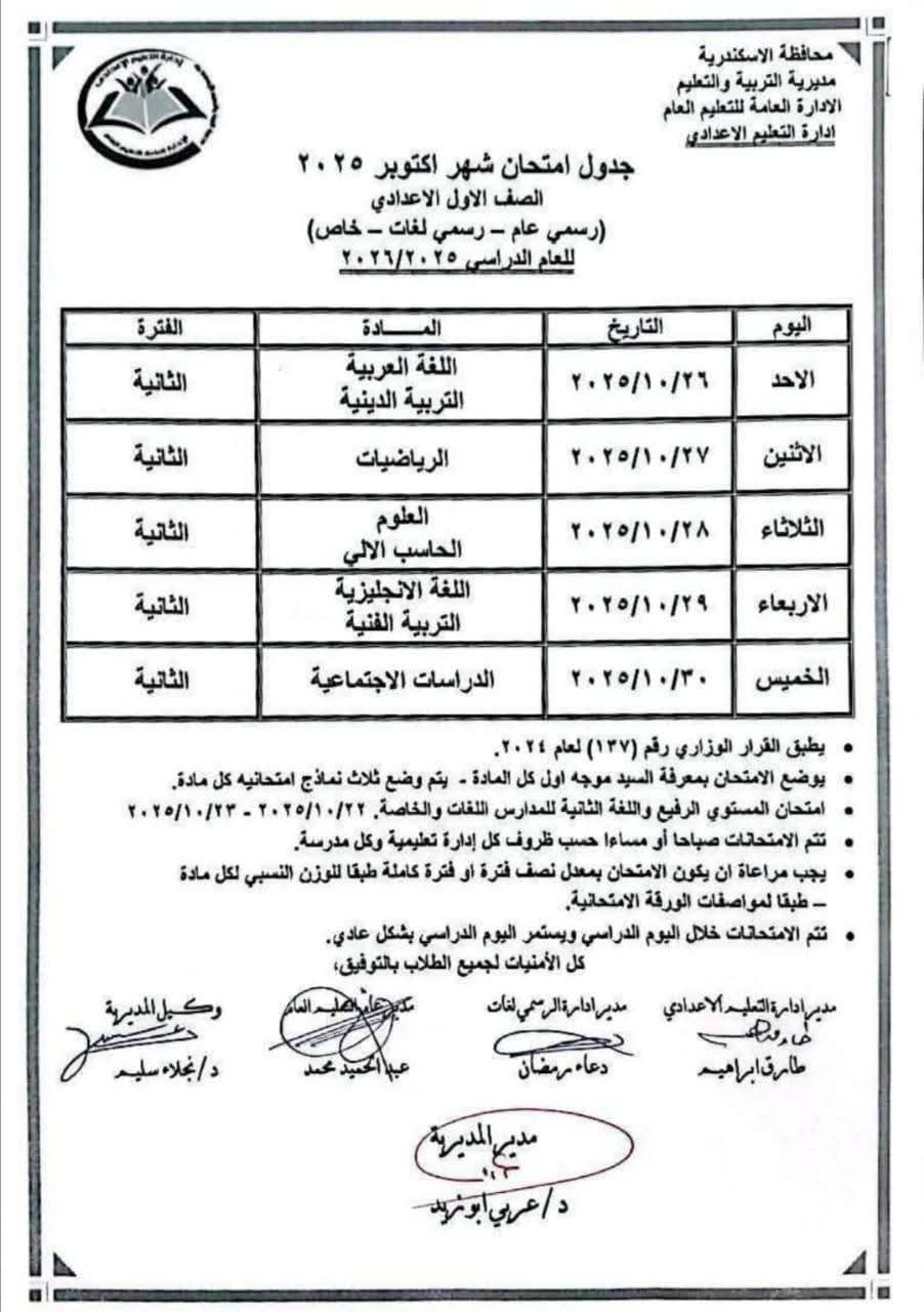 وجاء جدول امتحانات شهر أكتوبر للصف الأول الإعدادي كالتالي: