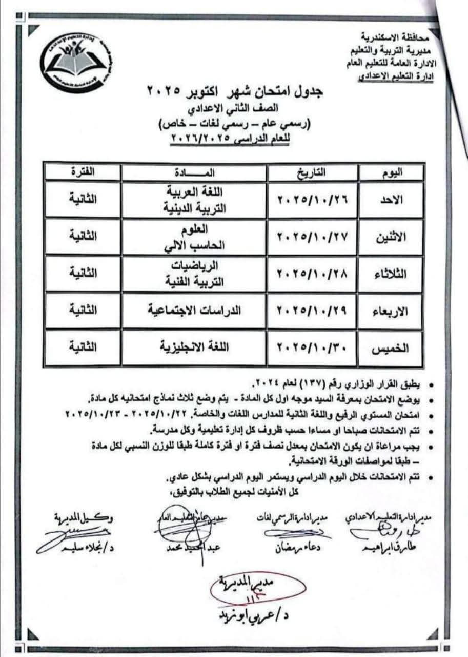 بينما جدول امتحانات شهر أكتوبر للصف الثاني الإعدادي كالتالي: