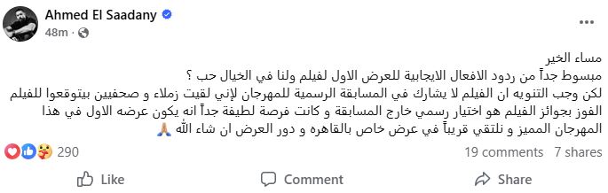 وكتب أحمد السعدني عبر حسابه الرسمي على موقع “فيسبوك”: "مساء الخير.. مبسوط جدًا من ردود الأفعال الإيجابية للعرض الأول لفيلم ولنا في الخيال حب، لكن وجب التنويه أن الفيلم لا يشارك في المسابقة الرسمية للمهرجان، لأنني لاحظت أن بعض الزملاء والصحفيين يتوقعون له الفوز بجوائز، بينما هو اختيار رسمي خارج المسابقة".