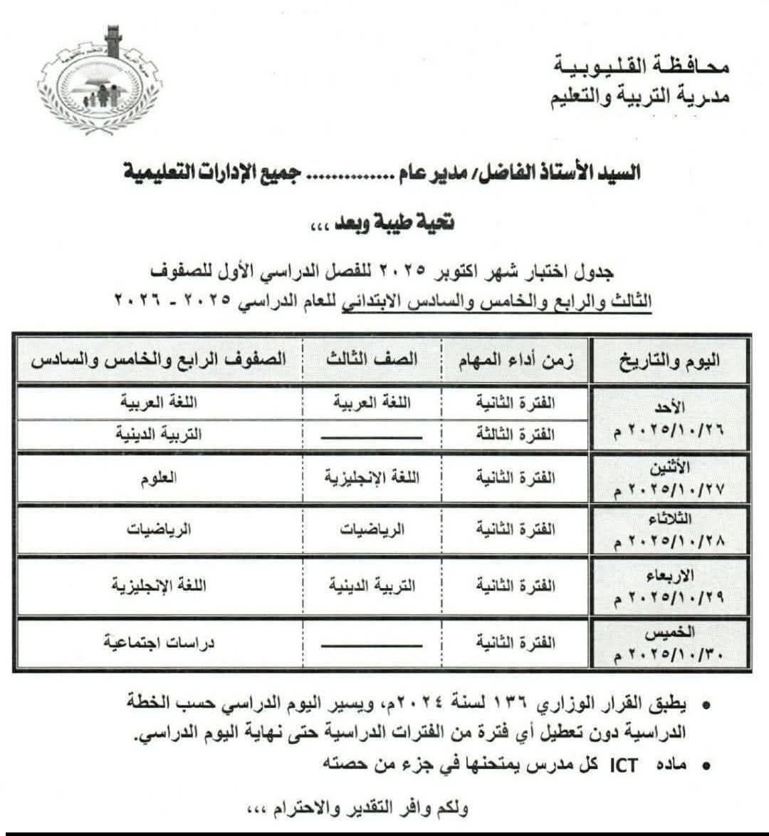 جدول امتحان شهر أكتوبر المرحلة الابتدائية بالقليوبية