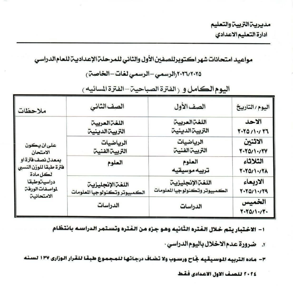 وجاء جدول امتحان شهر أكتوبر المرحلة الإعدادية بالقليوبية كالتالي: