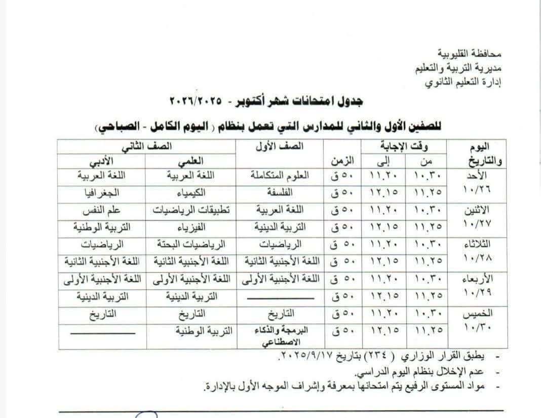 جدول امتحان شهر أكتوبر المرحلة الثانوية بالقليوبية