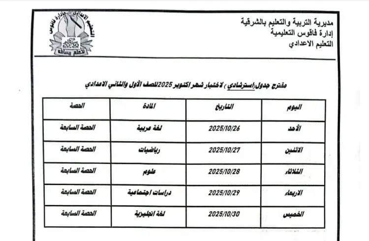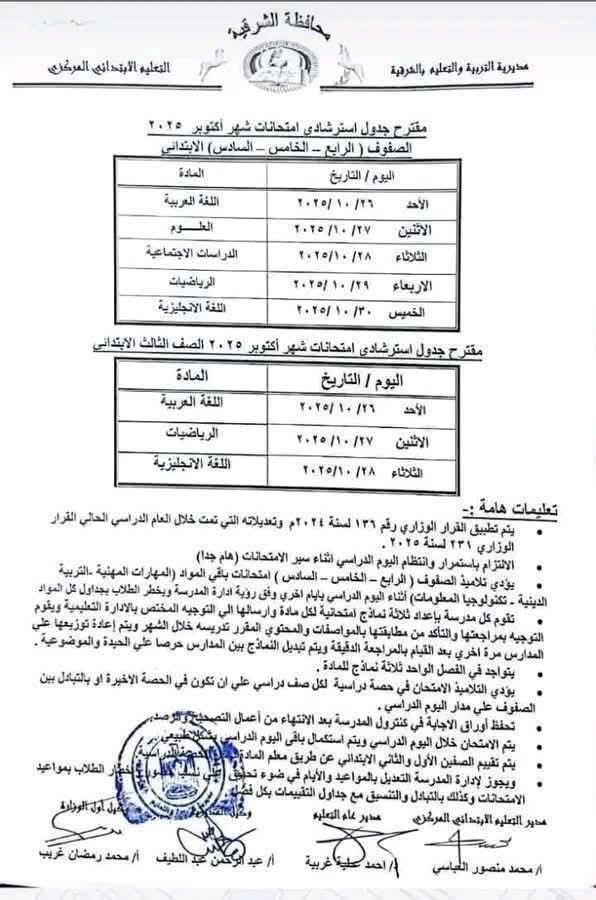 جدول امتحانات شهر أكتوبر 2025 لجميع المراحل التعليمية بالشرقية