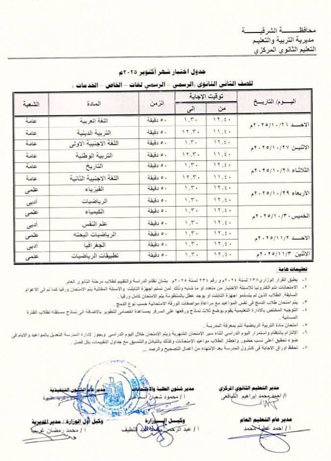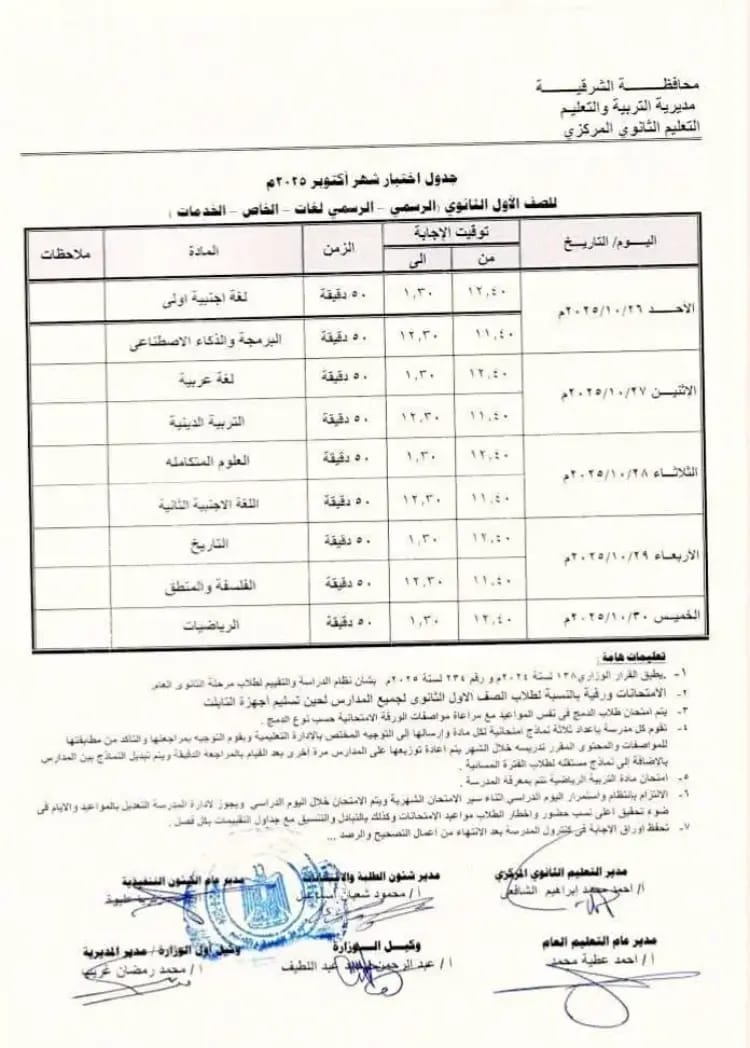 ويأتي جدول امتحانات شهر أكتوبر للمرحلة الثانوية بمحافظة الشرقية كما هو موضح في الصورة التالية: