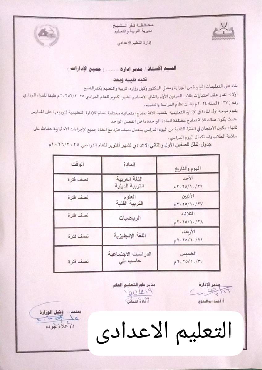 جدول امتحان شهر أكتوبر للمرحلة الإعدادية بكفر الشيخ