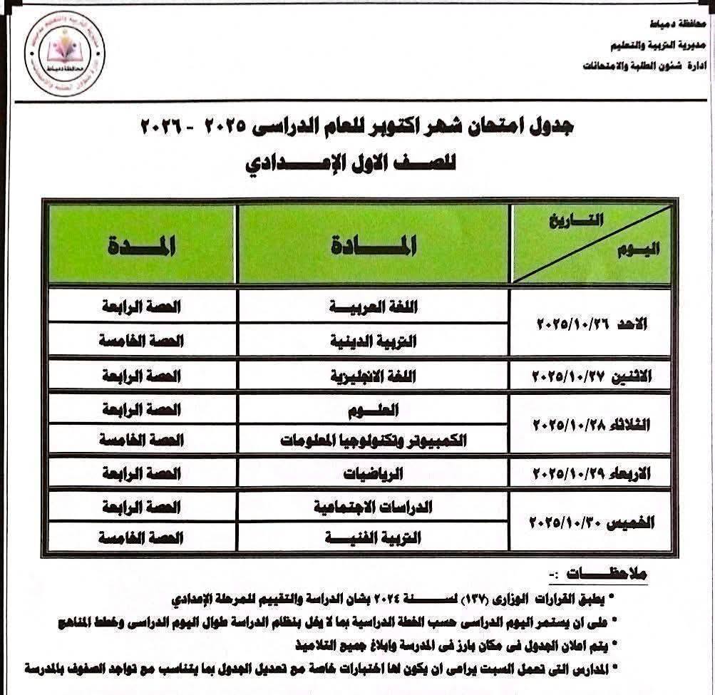 يمكن الاطلاع على جدول امتحانات شهر أكتوبر للصف الأول الإعدادي بمحافظة دمياط، من خلال الصورة التالية: