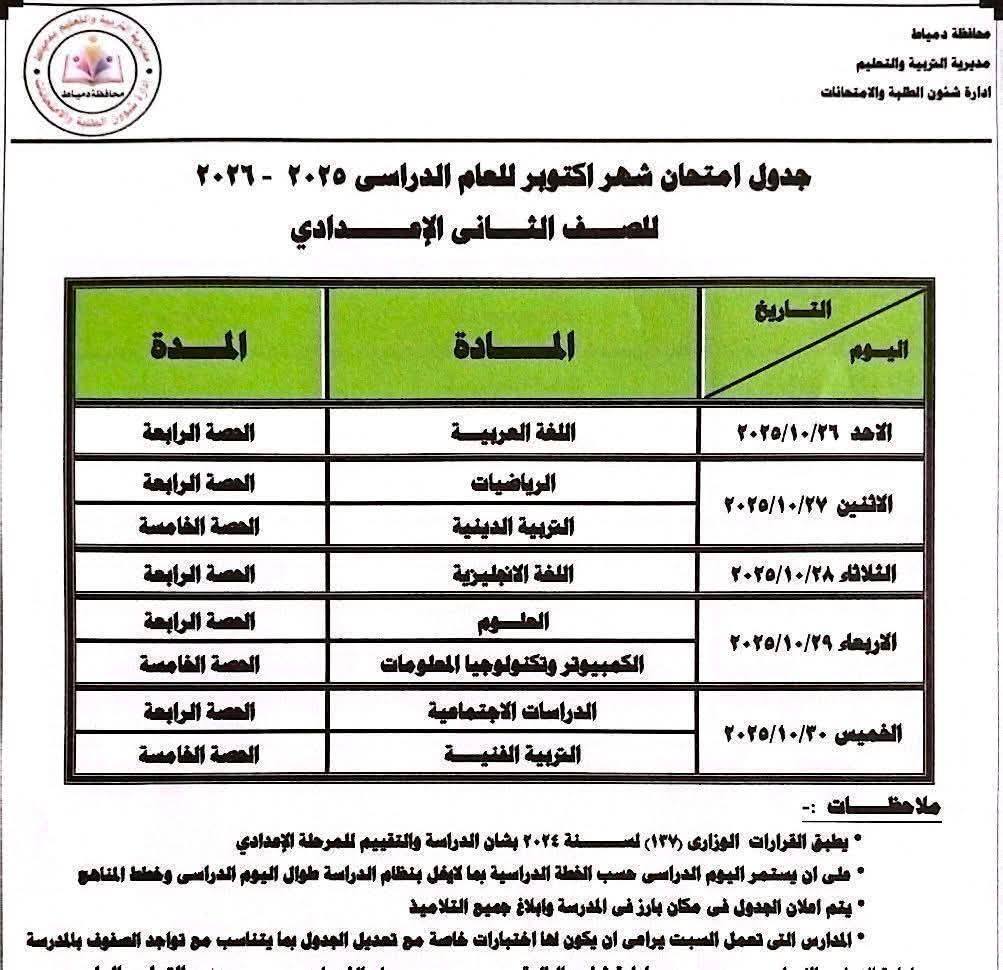 جدول امتحانات شهر أكتوبر للصف الثاني الإعدادي بدمياط
