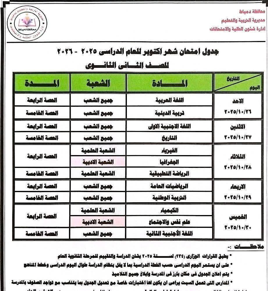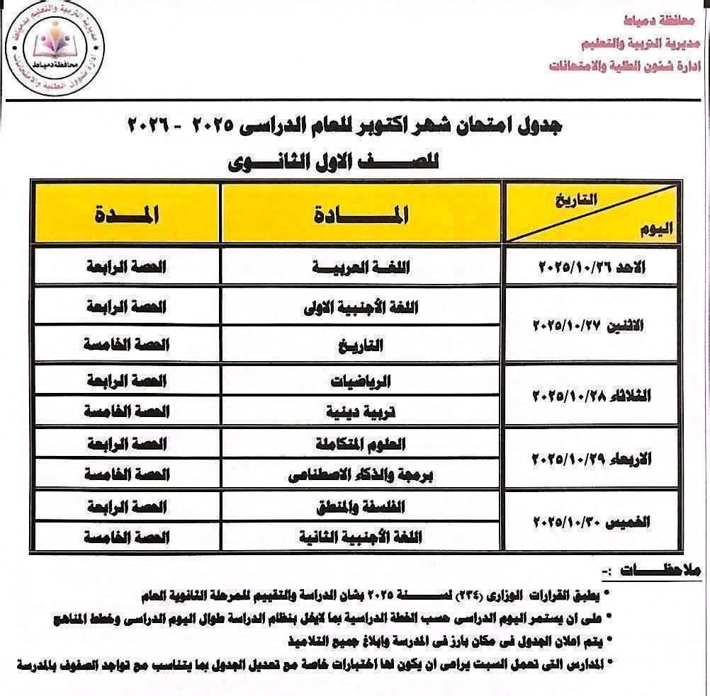 جدول امتحانات شهر أكتوبر للصف الثاني الثانوي بدمياط