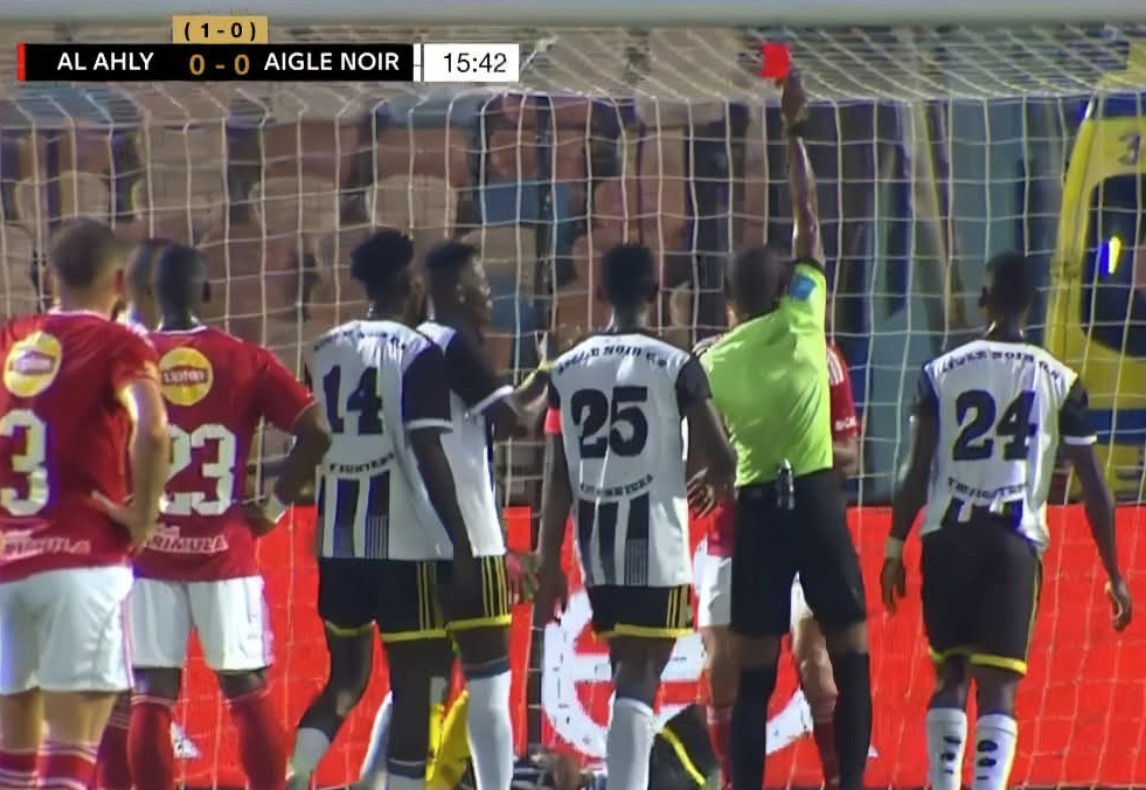 الدقيقة 14: أشهر حكم المباراة، البطاقة الحمراء لنيتس جراديشار، لاعب الأهلي، فبعد ضرب بدون كورة مع لاعب إيجل نوار.