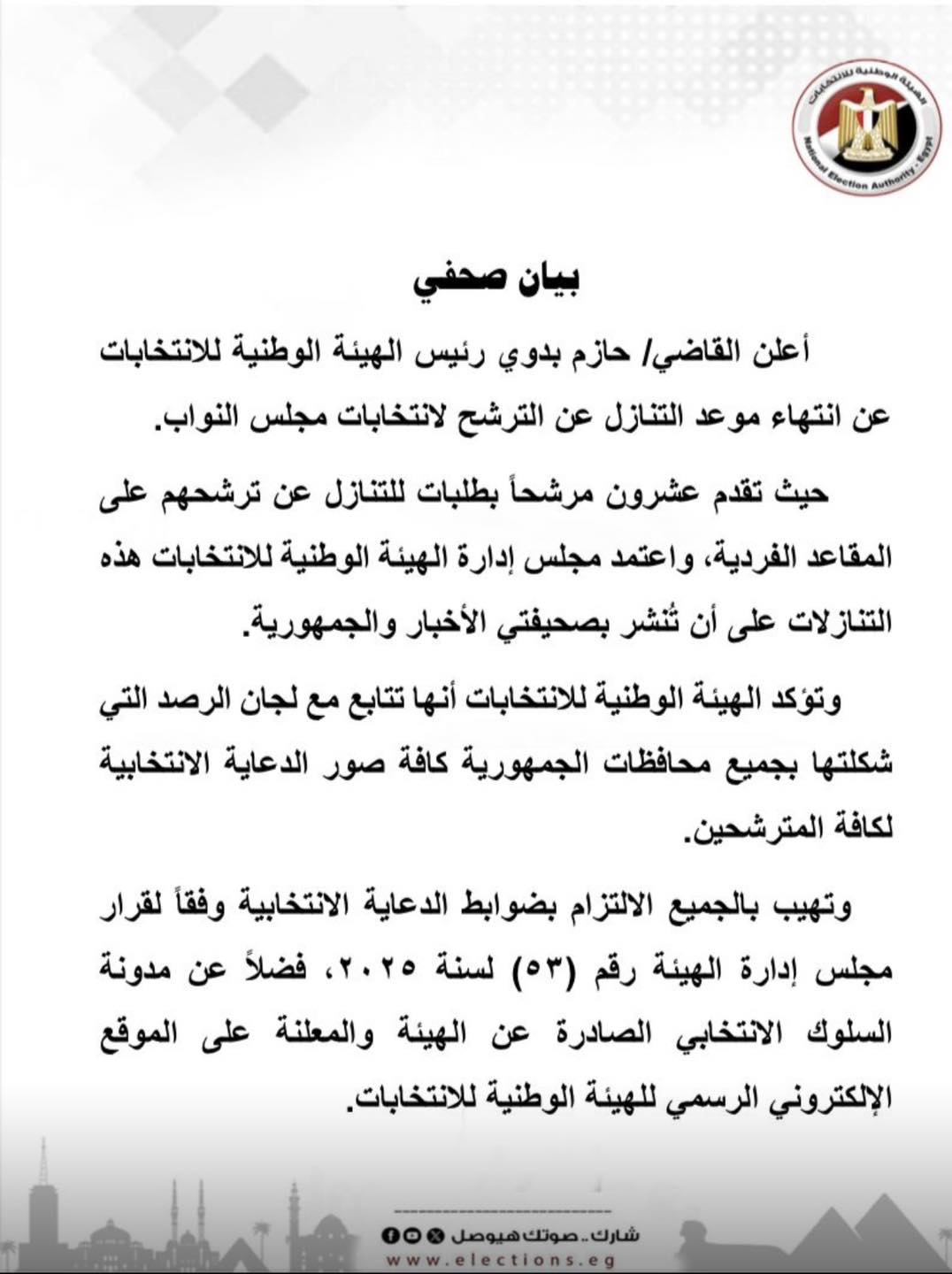 أعلن رئيس الهيئة الوطنية للانتخابات القاضي حازم بدوي، انتهاء موعد التنازل عن الترشح لانتخابات مجلس النواب 2025.