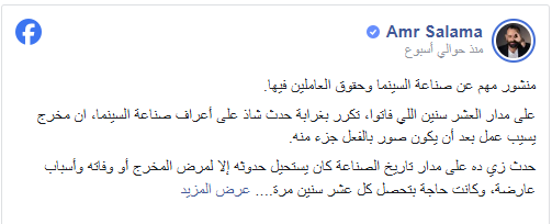 وكتب عمرو سلامة عبر صفحته على “فيسبوك”: “على مدار العشر سنين اللي فاتوا، تكرر بغرابة حدث شــاذ على أعراف صناعة السينما، أن مخرج يسيب عمل بعد أن يكون صور بالفعل جزء منه.. حدث زي ده على مدار تاريخ الصناعة كان يستحيل حدوثه إلا لمرض المخرج أو وفاته وأسباب عارضة".