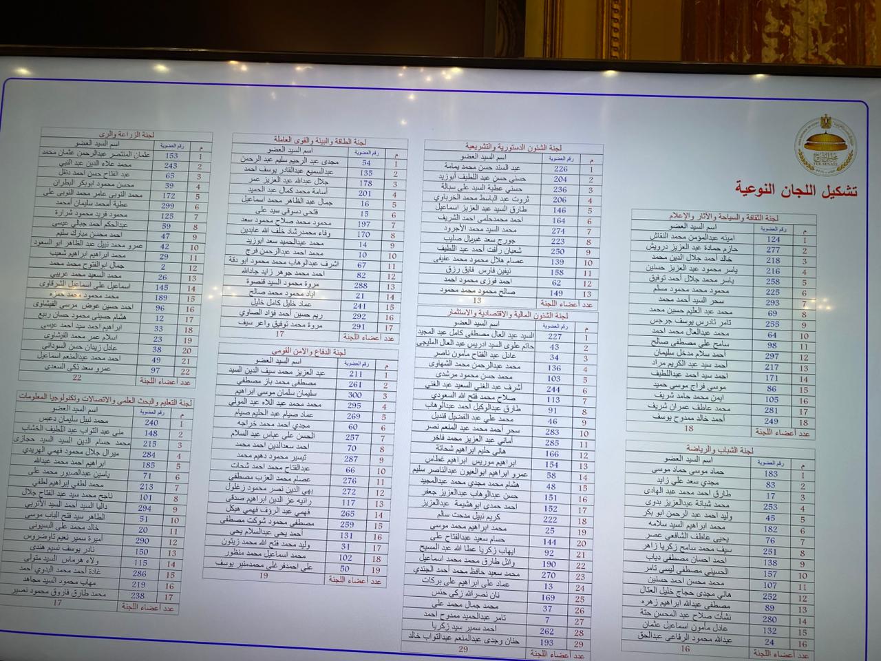 أعلن مجلس الشيوخ برئاسة المستشار عصام الدين فريد، قوائم تشكيل اللجان النوعية في المجلس بدور الانعقاد العادي الأول من الفصل التشريعي الثاني.
