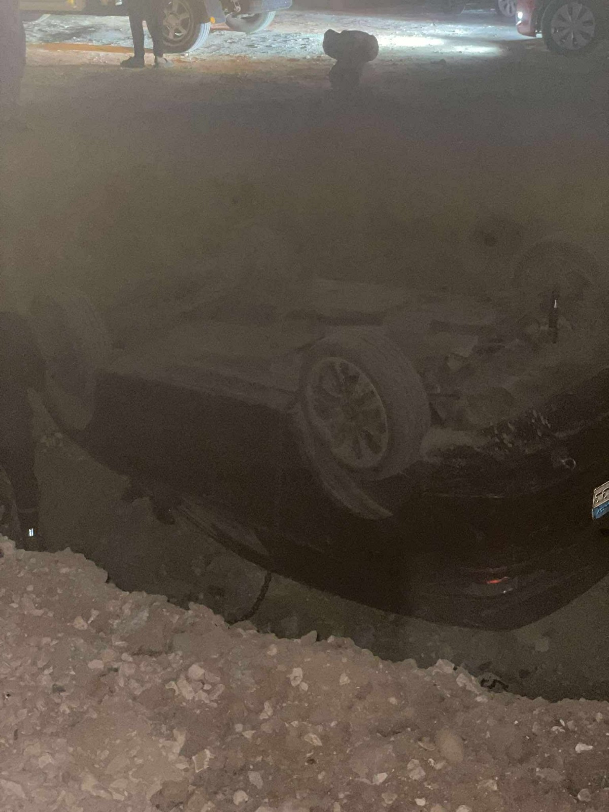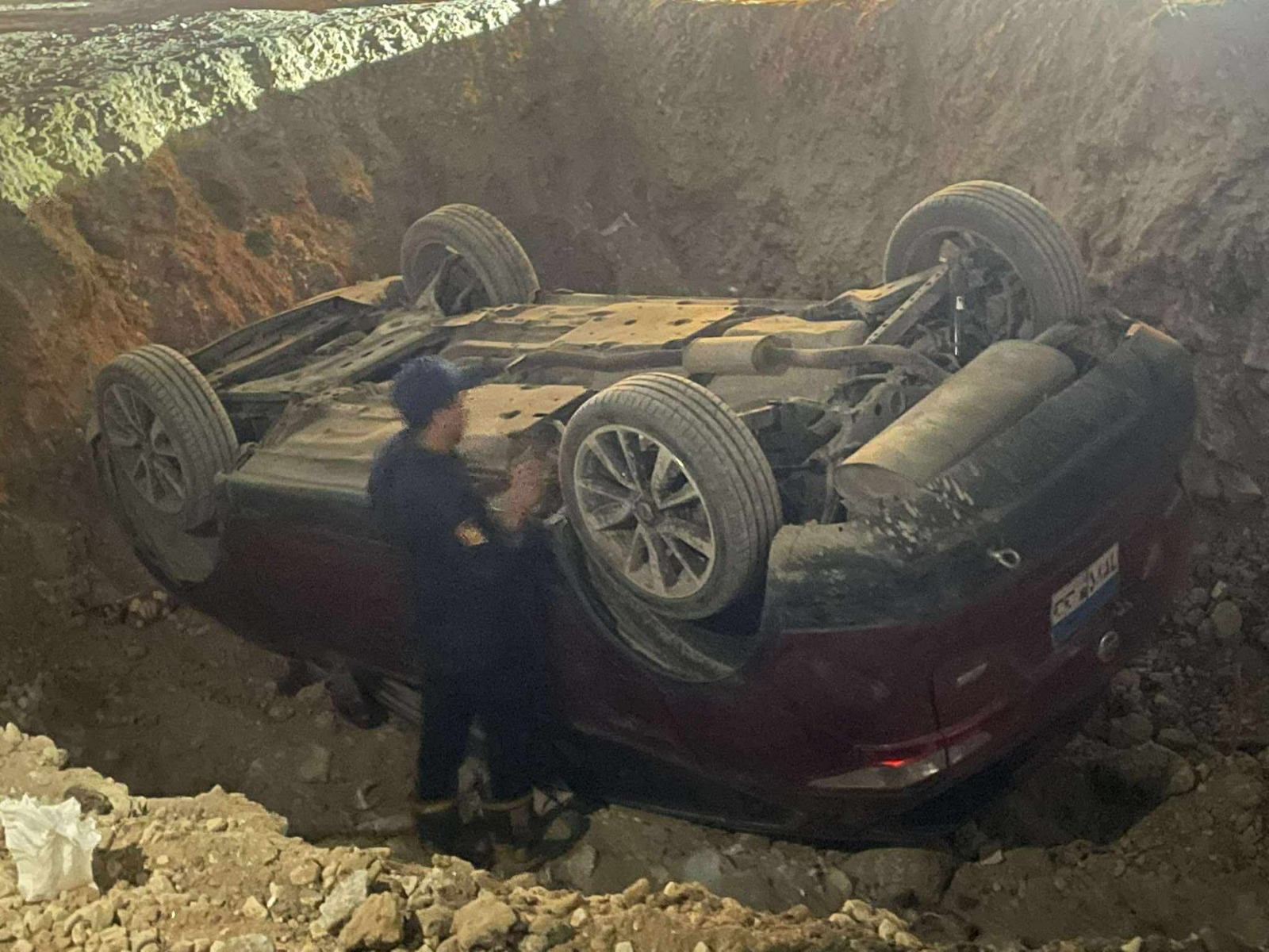 على الفور، انتقلت قوة أمنية ورجال المرور إلى موقع الحادث، وتبين من الفحص أن السيارة انقلبت أثناء سيرها، ما أدى إلى وقوعها داخل حفرة كبيرة.
