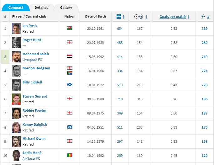 عزز النجم المصري محمد صلاح، جناح ليفربول، موقعه في المركز الثالث بقائمة الهدافين التاريخيين للريدز، بعدما سجل هدفًا في خسارة فريقه أمام برينتفورد بنتيجة 2–3، في المباراة التي أُقيمت مساء أول أمس بالعاصمة الإنجليزية لندن، ضمن منافسات الجولة التاسعة من الدوري الإنجليزي الممتاز "البريميرليج".