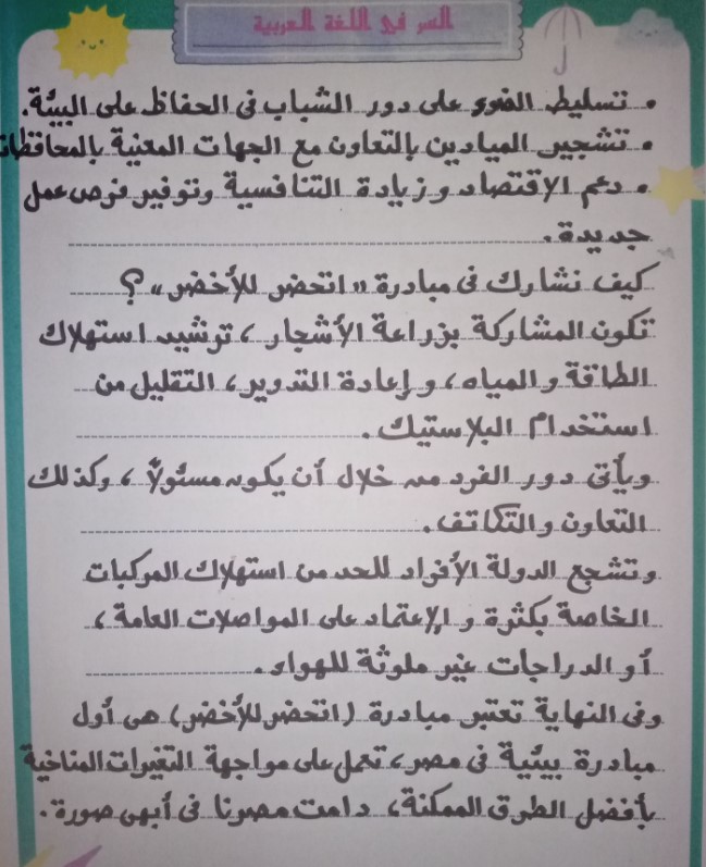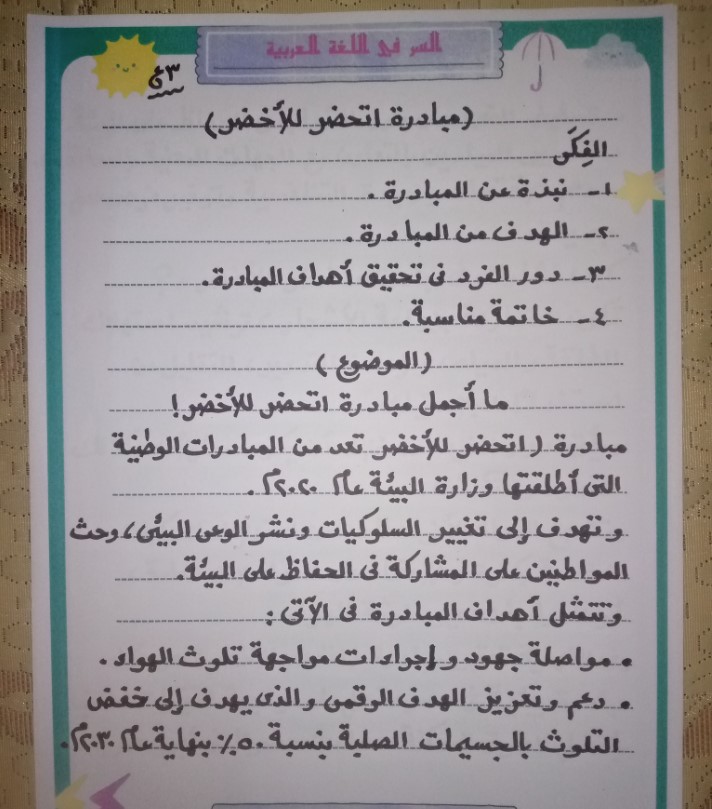 ويمكن للطلاب الراغبين في كتابة موضوع تعبير عن مبادرة اتحضر للأخضر الاطلاع على نموذج لموضوع التعبير من خلال الصور التالية: