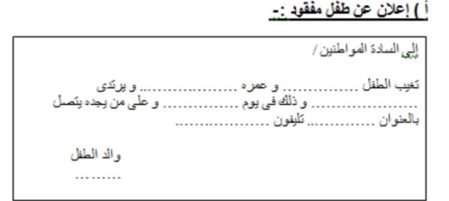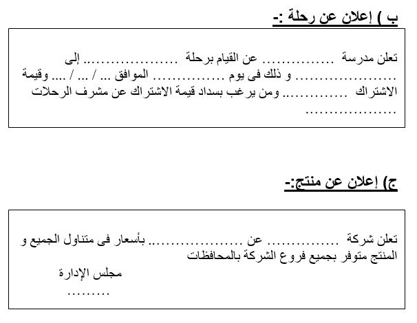 ونستعرض بعض الأمثلة الاسترشادية لمساعدة الطلاب على كتابة الإعلان في التعبير الوظيفي وهي: