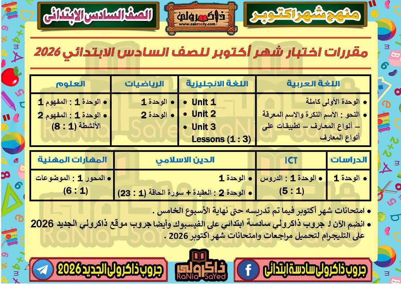 امتحانات شهر أكتوبر للصف السادس الابتدائي 2025-2026