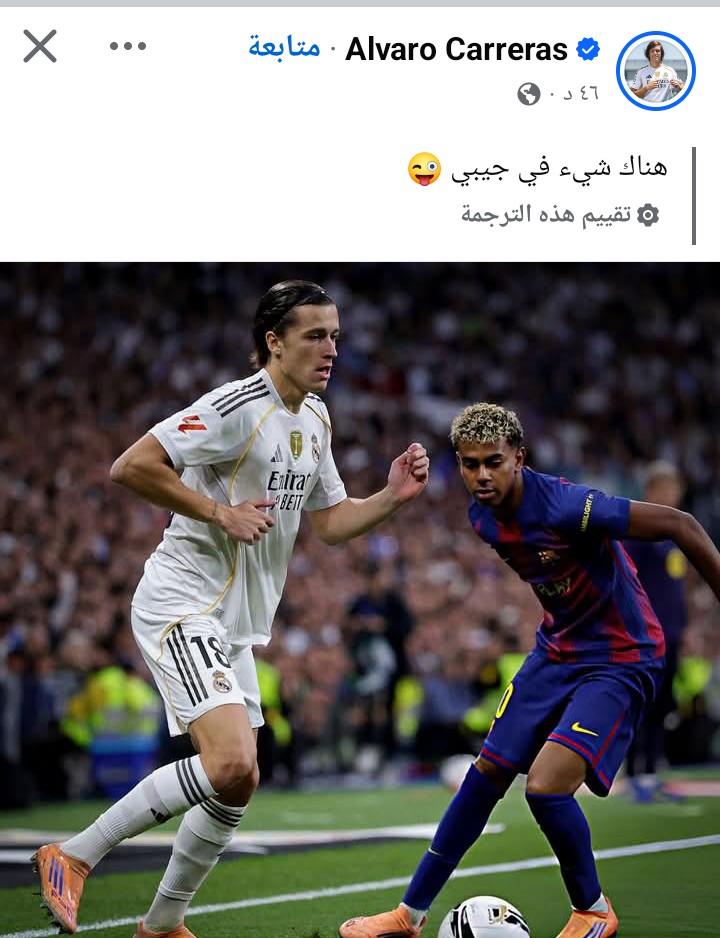 واستغل ألفارو كاريراس الظهير الأيسر لفريق ريال مدريد، أجواء الانتصار للسخرية من لامين يامال، حيث نشر عبر حسابه الرسمي على “فيسبوك” صورة تجمعه بنجم برشلونة الشاب، وعلّق عليها قائلًا: "هناك شيء في جيبي”، في إشارة ساخرة لتفوقه عليه في الكلاسيكو.