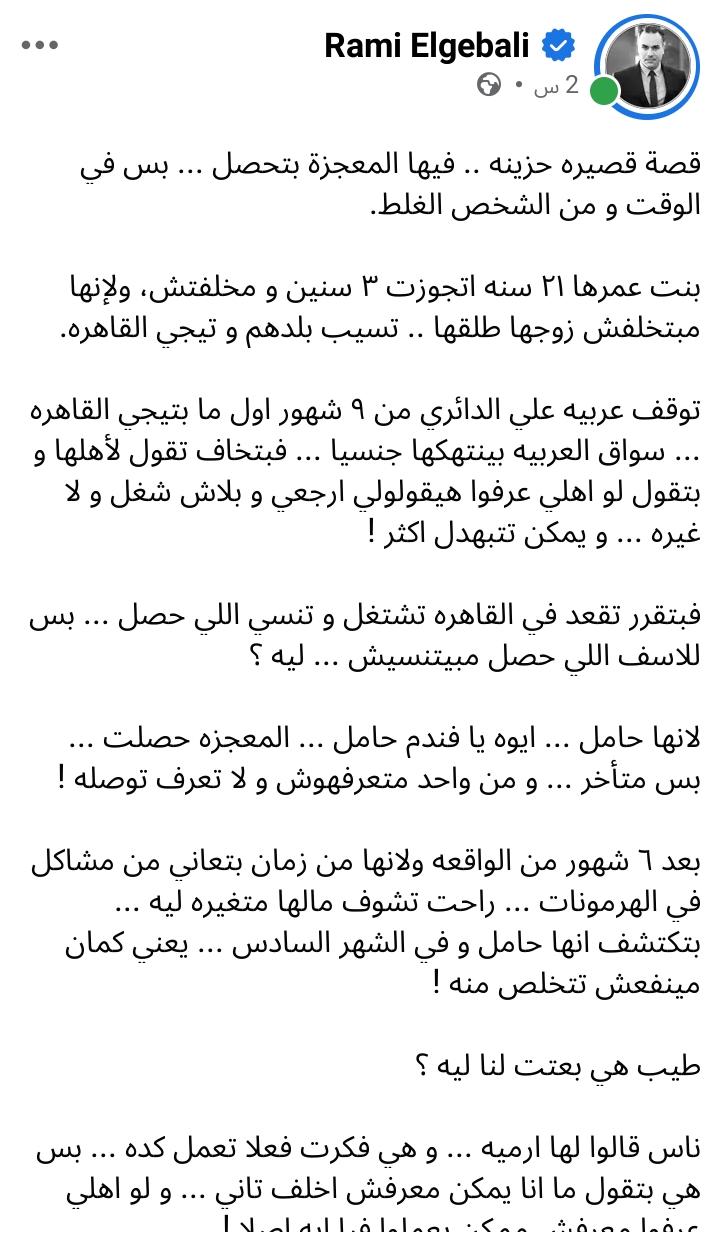 كتب رامي الجبالي، على صفحته الشخصية منشورًا لم يتخيل أنه سيثير مواقع التواصل في ساعات قليلة، إذ حمل قصة فتاة تعرضت لاعتداءٍ مروع على يد سائق سيارة أجرة في القاهرة، بعدما تركت مدينتها لتبدأ حياة جديدة بعيدًا عن الماضي.