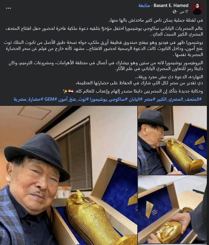 وكتب أحد الحسابات: “عالم المصريات الياباني ساكوجي يوشيمورا احتفل مؤخرًا بتلقيه دعوة ملكية فاخرة لحضور حفل افتتاح المتحف المصري الكبير السبت الجاي، يوشيمورا ظهر في فيديو وهو بيفتح صندوق قطيفة أزرق ملكي، جواه نسخة طبق الأصل من تابوت الملك توت عنخ آمون، وداخل التابوت كانت الدعوة الرسمية لحضور الافتتاح”.