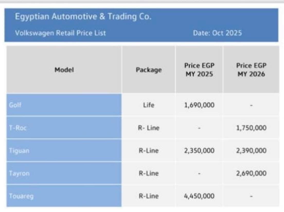 وانخفض سعر فولكس فاجن جولف موديل 2025، بقيمة 60 ألف جنيه، بالإضافة لطرح طرازي طوارق وتيجوان موديل 2026.