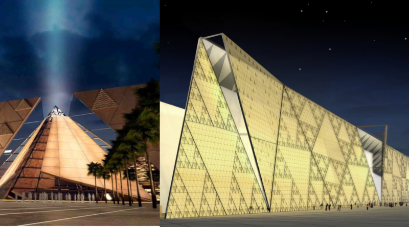 فازت شركة هينغهان بنغ للمهندسين المعماريين بأيرلندا في عام 2003 بأفضل تصميم للمتحف المصري الكبير، وهو التصميم الذي تم تنفيذه. وتدور فكرته حول أن تُمثل أشعة الشمس الممتدة من قمم الأهرامات الثلاثة عند التقائها كتلة مخروطية هي المتحف المصري الكبير.