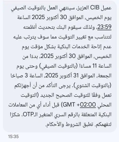 أرسل عدد من البنوك المصرية رسائل نصية (SMS) للعملاء، تُفيد بتعطيل مؤقت للخدمات المصرفية الرقمية مساء الخميس وصباح الجمعة، بالتزامن مع انتهاء العمل بالتوقيت الصيفي وبدء التوقيت الشتوي في مصر.