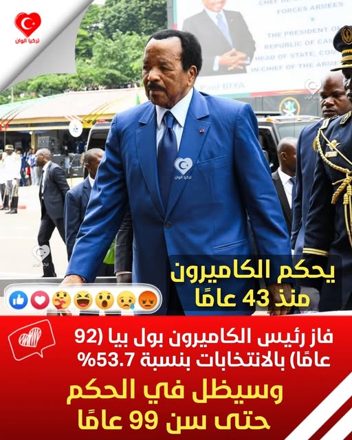 وأثار فوز بيا الجديد جدلًا واسعًا حول مستقبل الحكم في البلاد، إذ من المتوقع أن يبقى في منصبه حتى يقترب من عامه المئة، في وقتٍ يشهد فيه المجتمع الكاميروني تصاعدًا في المطالبات بالتغيير والعدالة السياسية بحسب مجلة "جون أفريك".