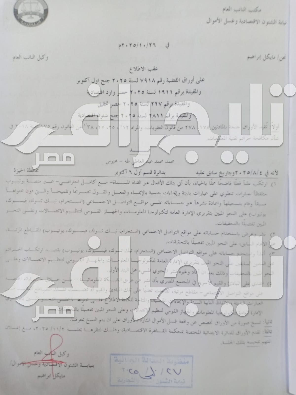 حصلت “تليجراف مصر”، على نص أمر إحالة البلوجر الشهير محمد عبدالعاطي، المتهم في قضية نشر الفسق والفجور عبر مواقع التواصل الاجتماعي وغسل الأموال، عقب القبض عليه في أغسطس الماضي.