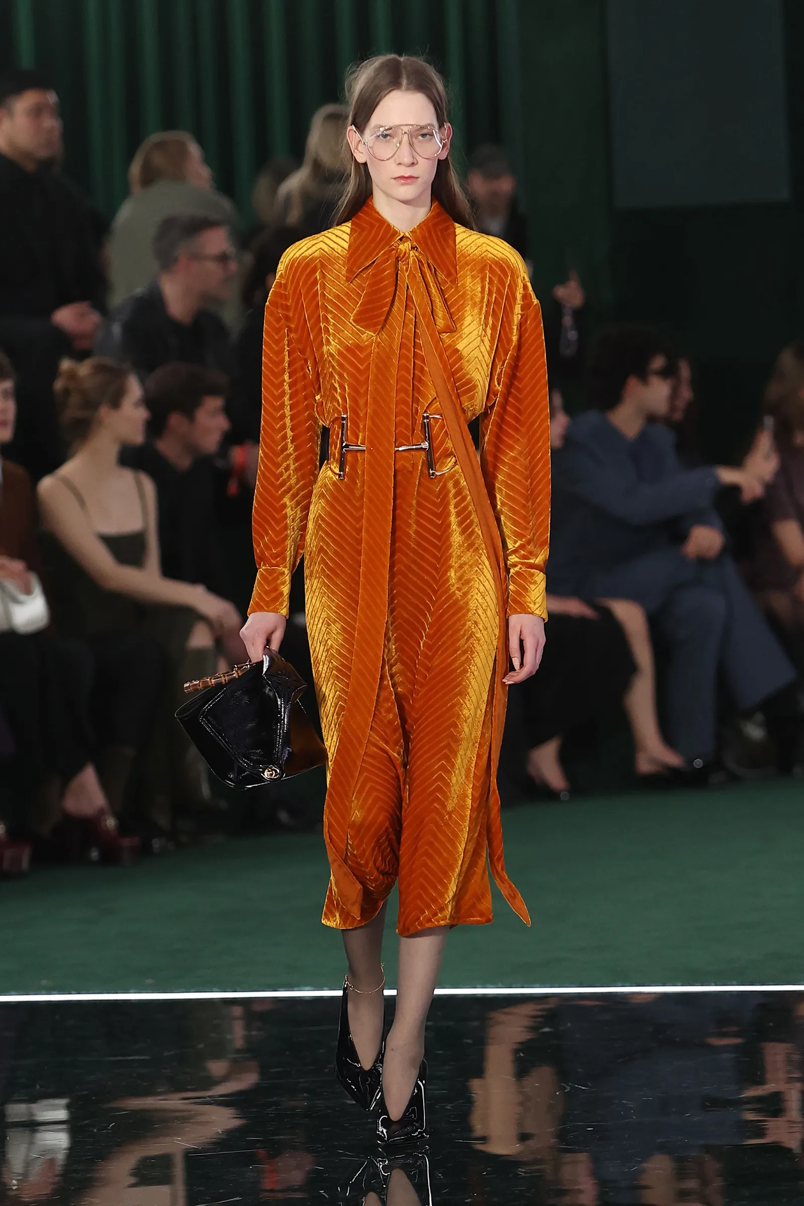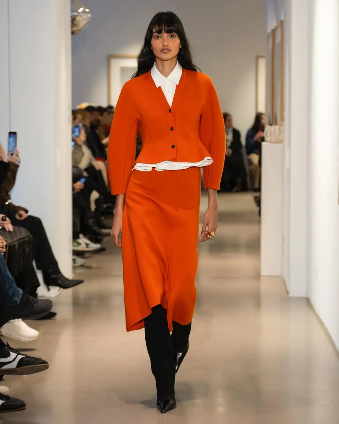 وتجسد درجات البرتقالي الدافئة الخريف، وقد أضافت درجات البرتقالي المحروق واليقطيني والأصفر دفئًا وحيويةً على منصة العرض، من فستان جوتشي المخملي على شكل قميص إلى طقم آشلين بنقشة الببلوم البرتقالية.