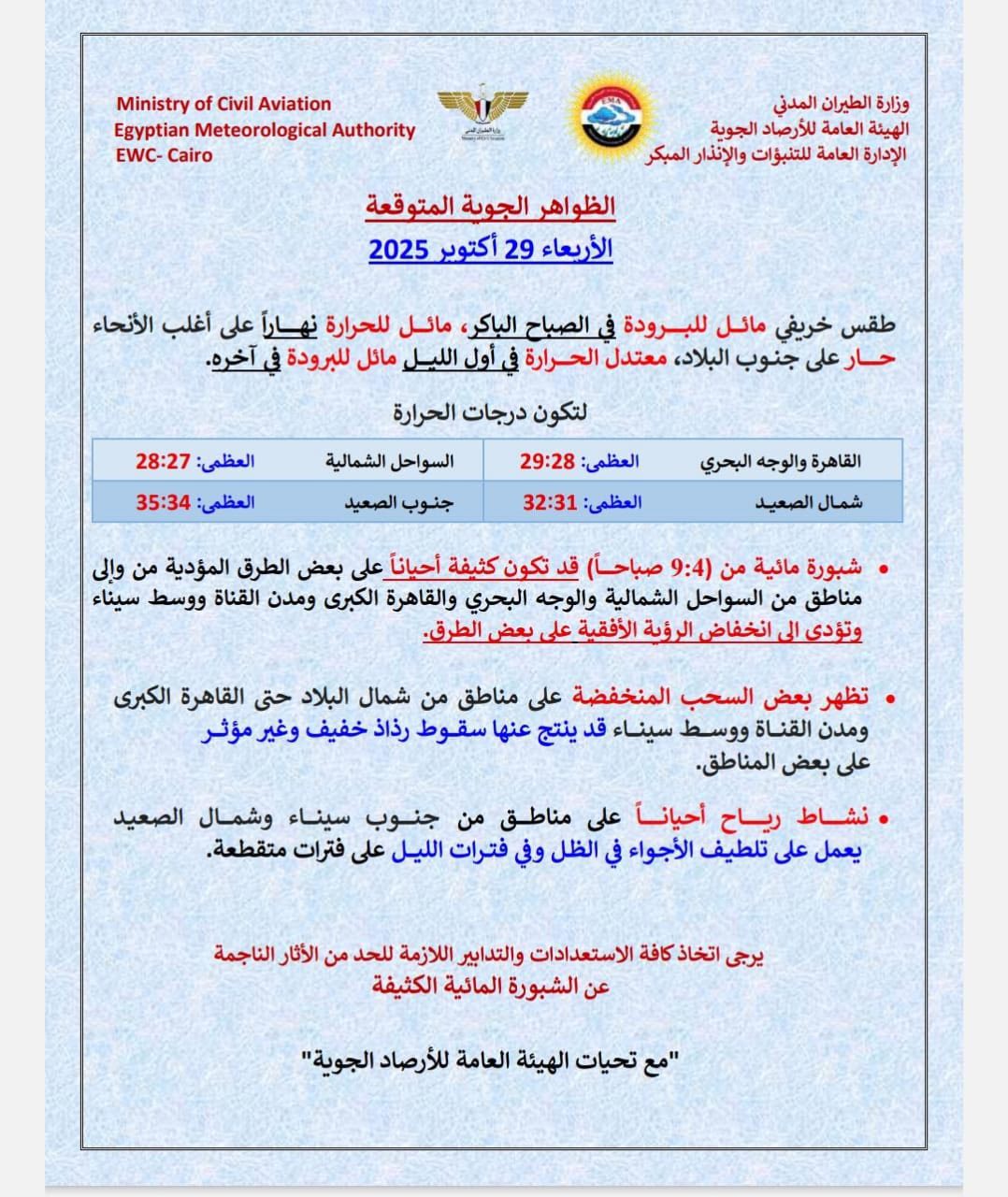 وحذّرت الأرصاد من شبورة مائية، من الرابعة حتى التاسعة صباحًا على بعض الطرق الزراعية والسريعة القريبة من السواحل الشمالية والوجه البحري والقاهرة الكبرى ومدن القناة ووسط سيناء، وقد تكون كثيفة أحيانًا وتؤدي إلى انخفاض الرؤية الأفقية على بعض الطرق.