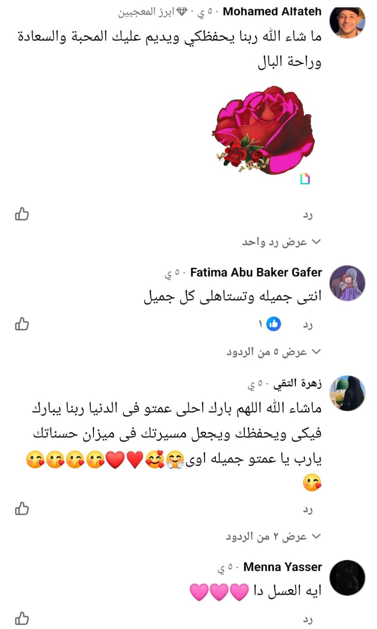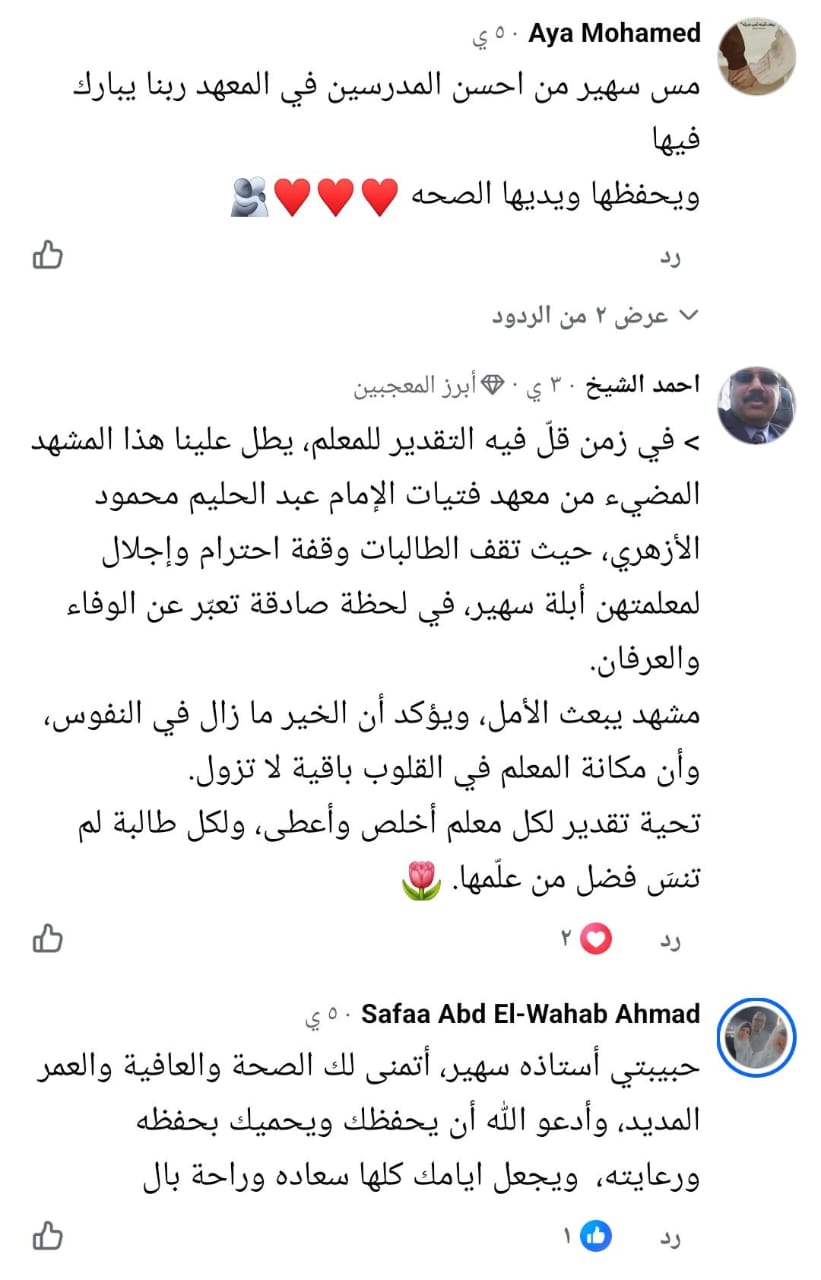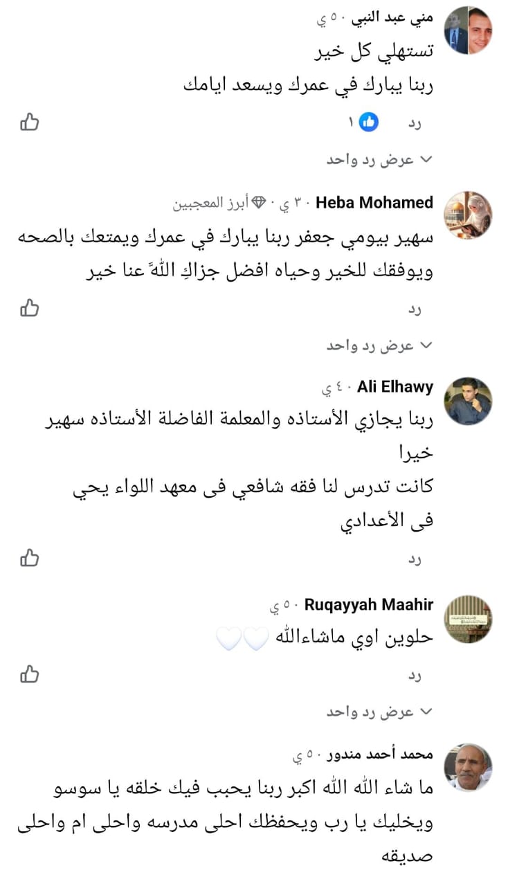 وكتبت فطيمة: "أنتِ جميلة وتستاهلي كل خير"، ودون علي: "ربنا يجازي الأستاذة والمعلمة سهير خيرًا، كانت تدرس لنا".