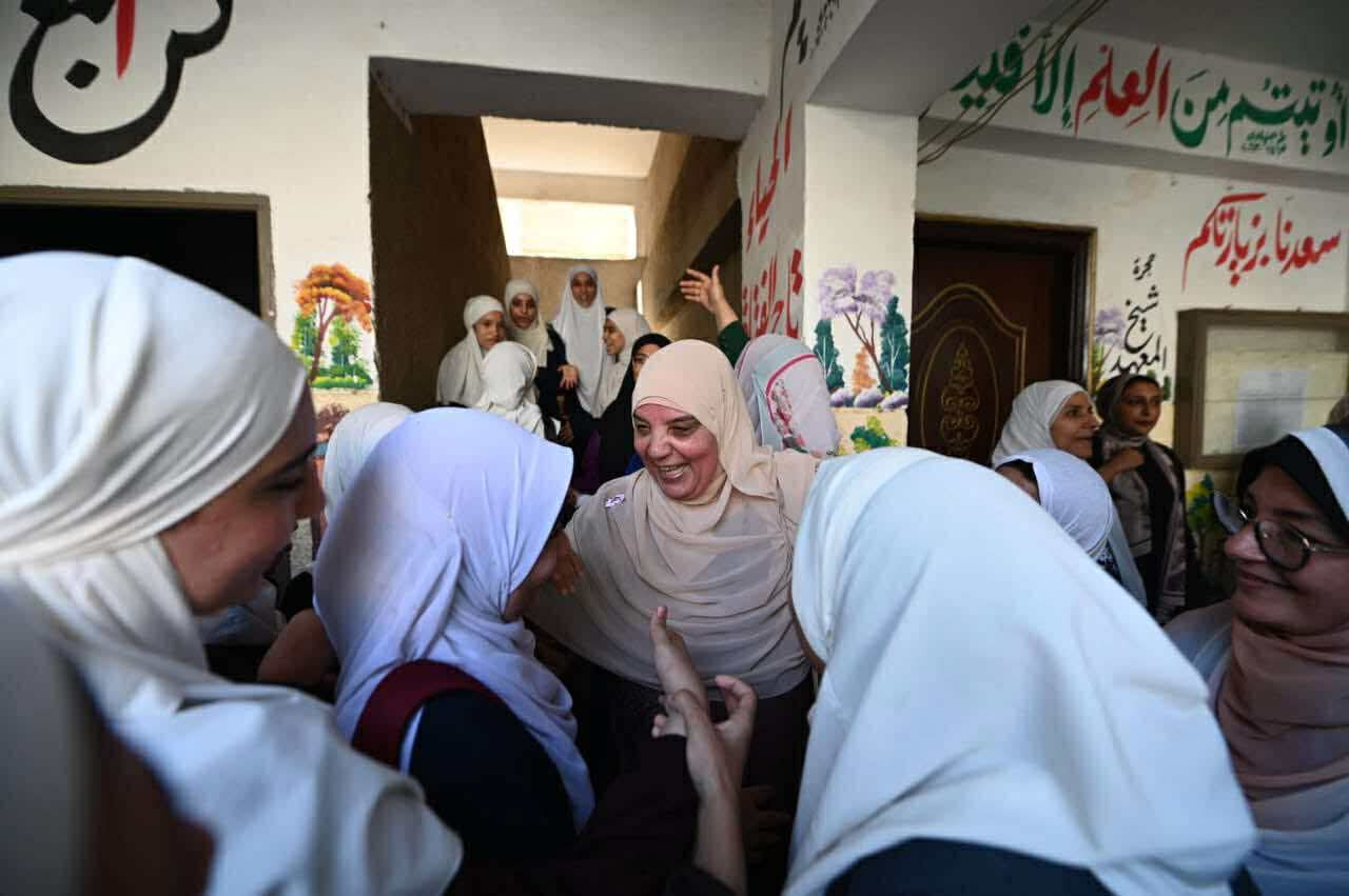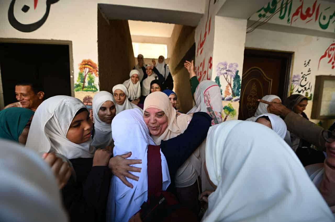 ظهرت المعلمة وسط حشود من الفتيات، اللاتي تناوبن على احتضانها وتوديعها بحزن والدموع تبلل وجنتيهم، لافتراقهم عنها.