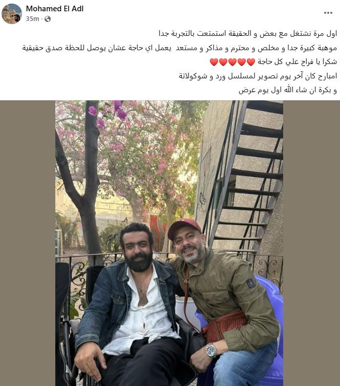 نشر العدل عبر حسابه الرسمي على موقع “فيسبوك” صورة جمعته بمحمد فراج، وعلّق عليها قائلًا: "أول مرة نشتغل مع بعض، والحقيقة استمتعت بالتجربة جدًا".