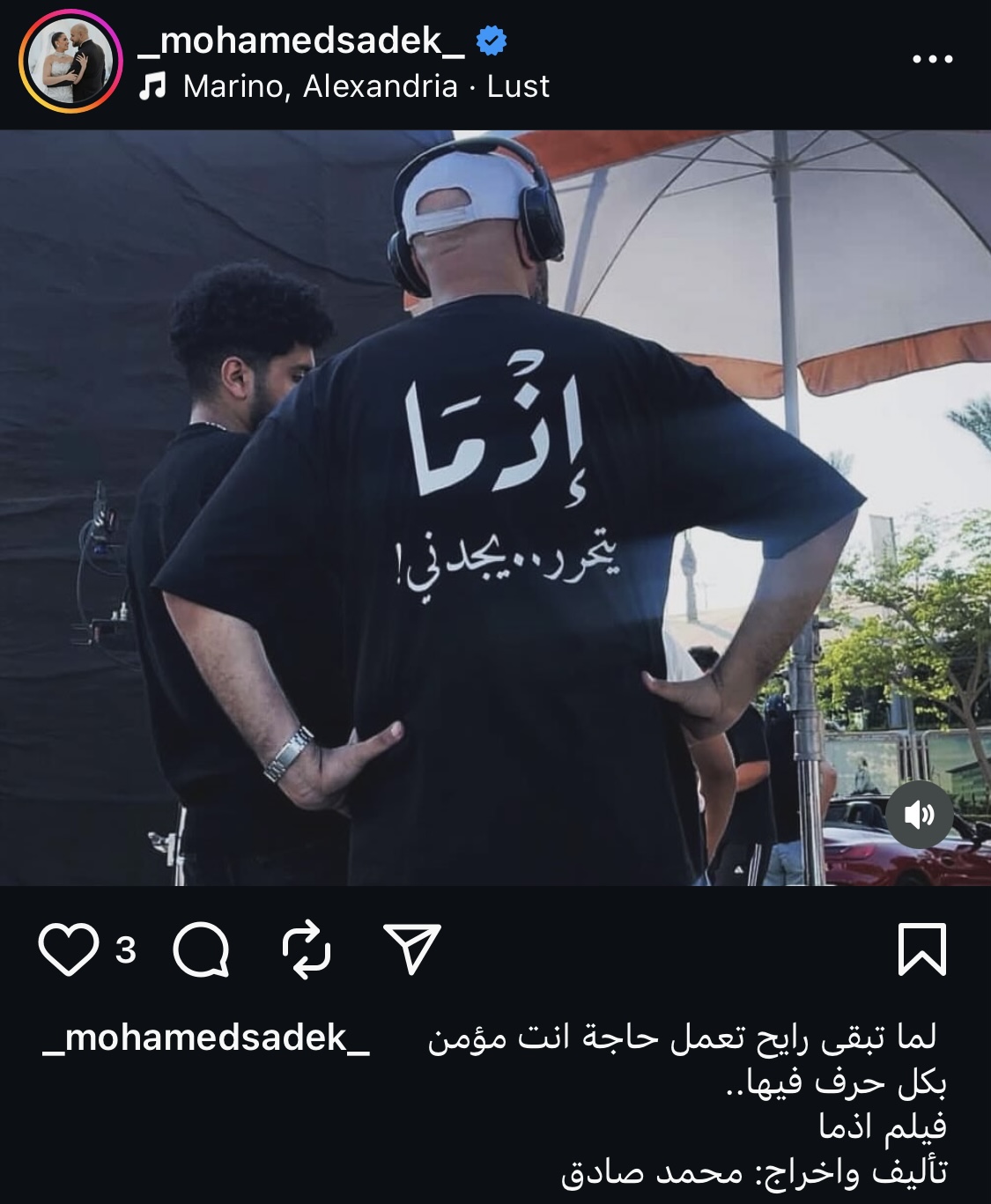 ونشر محمد صادق صورة الكواليس عبر حسابه الرسمي على منصة “إنستجرام” وعلق عليها بالقول: "لما تبقى رايح تعمل حاجة أنت مؤمن بكل حرف فيها، فيلم إذما، تأليف وإخراج محمد صادق”.