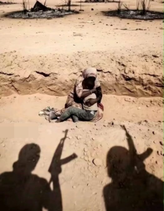 وجاءت واحدة من بين المشاهد التي وثقت بالصور، أم سودانية تحتضن صغيرها قبل إعدامها، ويوضح المشهد خوف السيدة التي جلست محتضنة ابنها وتظهر قوات الدعم السريع بالظل على الأرض.