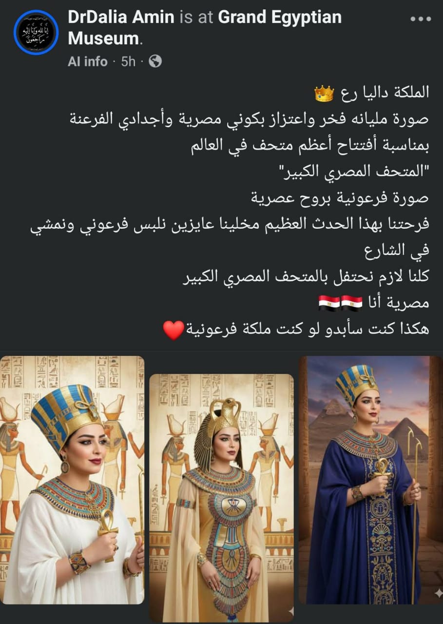واستخدم مشاهير وصناع محتوى المهتمين بافتتاح المتحف المصري الكبير، الذكاء الاصطناعي لتحويل صورهم على شكل الملوك والملكات قديمًا، وظهر وراءهم صور الأهرامات وكل ما يدل على مصر القديمة.