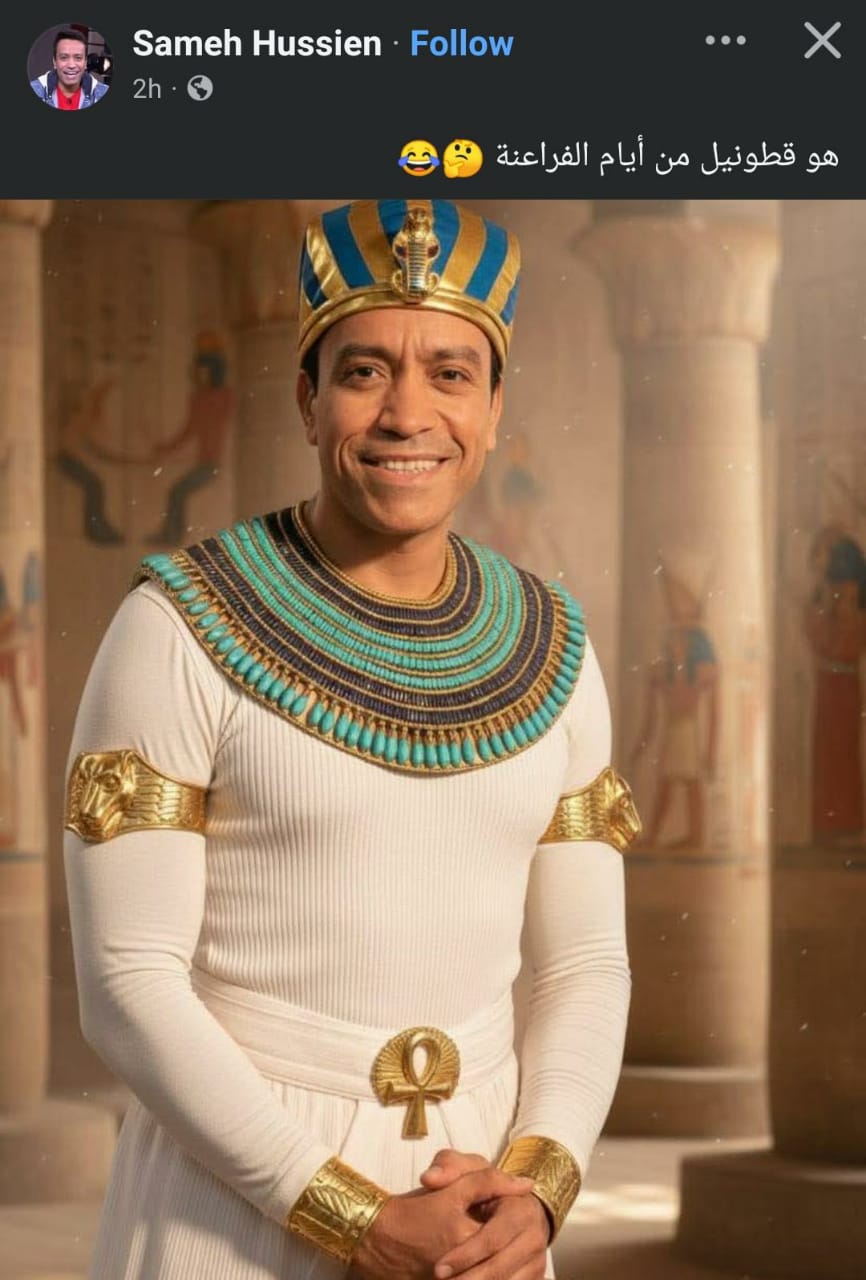 ونشر الفنان سامح حسين صورة له بإطلالة فرعونية مضحكة، وكتب "هو قطونيل من أيام الفراعنة"، في لمحة فكاهية عن الزي الذي صنعه له البرنامج من القطن.