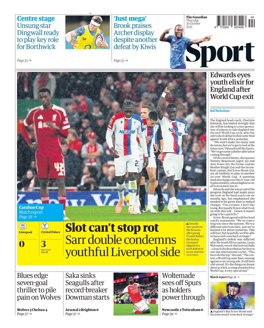 أما صحيفة "تليجراف" فاختارت عنوانًا صريحًا: “انهار كل شيء يا سلوت”، وأوضحت أن الخسارة أمام كريستال بالاس على ملعب "أنفيلد" ووسط الجماهير تُعد ضربة قاسية جديدة للفريق الذي يعاني غياب التنظيم الدفاعي وضعف الفاعلية الهجومية، رغم امتلاك أسماء بارزة على غرار محمد صلاح وداروين نونيز.