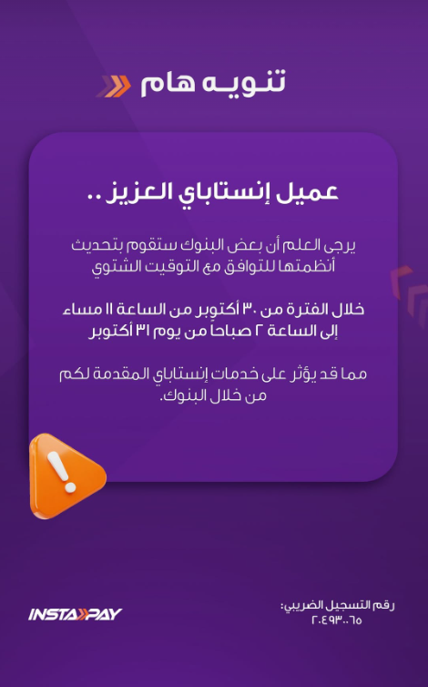 أعلن تطبيق إنستاباي (InstaPay Egypt)، المتخصص في خدمات التحويلات والمعاملات المالية الفورية، توقف مؤقت لخدماته مساء اليوم الخميس 30 أكتوبر 2025، بسبب تحديث عدد من البنوك المصرية لأنظمتها التقنية للتوافق مع بدء العمل بالتوقيت الشتوي لعام 2025.