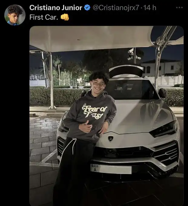 شارك كريستيانو رونالدو جونيور، نجل أسطورة كرة القدم البرتغالي كريستيانو رونالدو، متابعيه على إنستجرام بصورة له بجانب سيارته الجديدة، وكتب في تعليق مرافق للصورة: "أول سيارة لي".