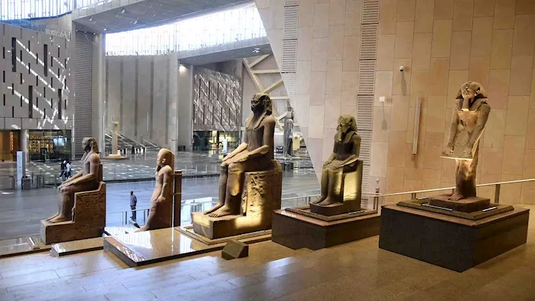 ويضم المتحف المصري الكبير، أكثر من 57 ألف قطعة أثرية، وتبلغ مساحة مدخل المتحف الرئيسي حوالي 7 آلاف متر مربع، وبه تمثال الملك رمسيس الثاني، وبه الدرج العظيم الذي مساحته تبلغ حوالي 6 آلاف متر مربع، وارتفاع يوازي 6 طوابق.