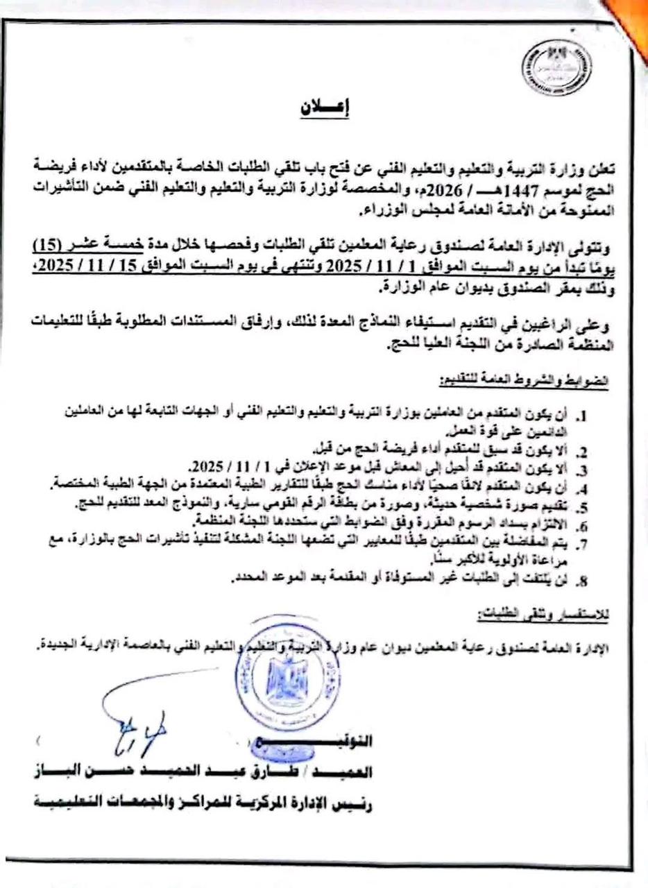 وجاءت الضوابط والشروط للتقديم لموسم حج 2025 بوزارة التربية والتعليم، كما يلي: